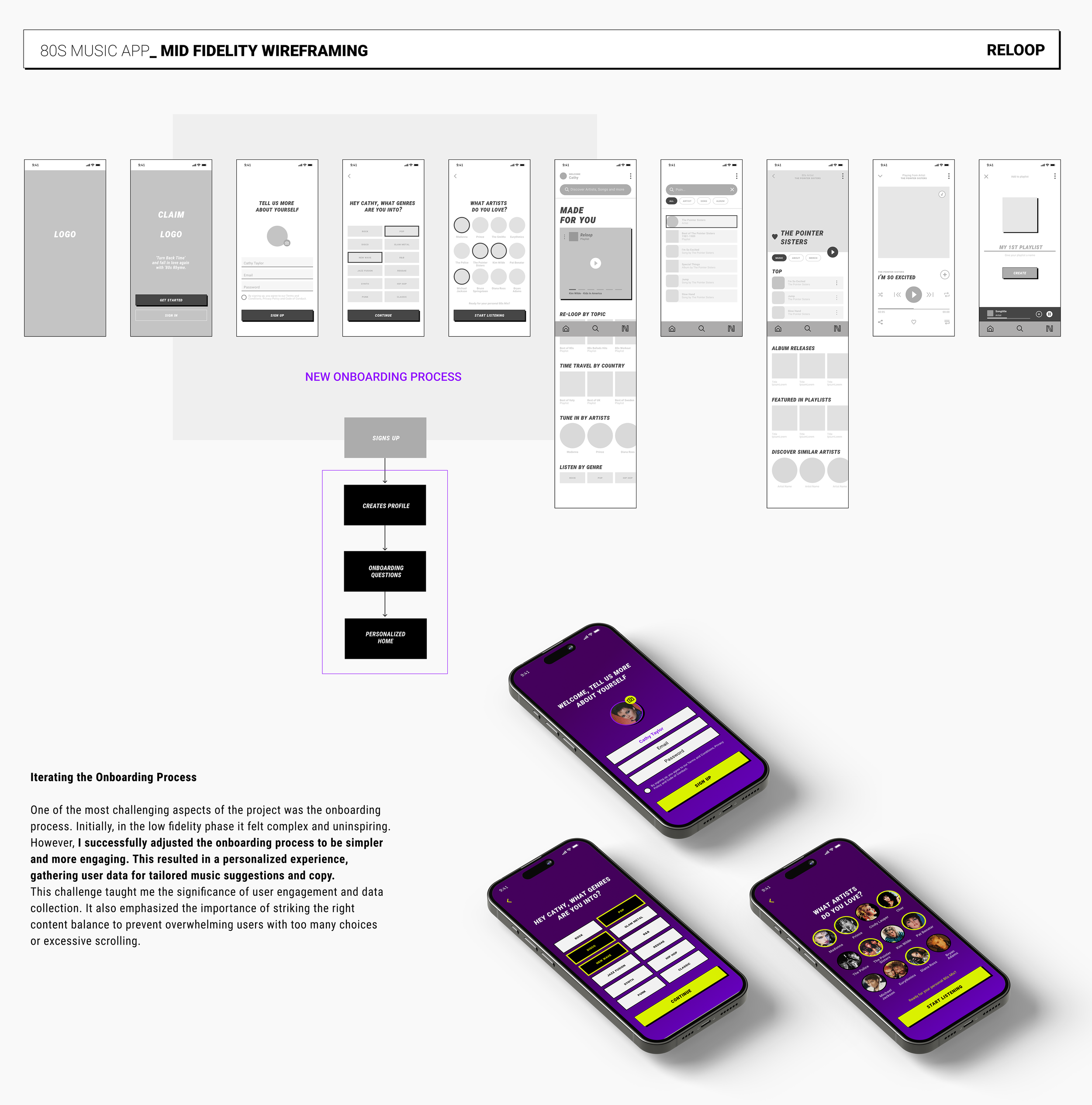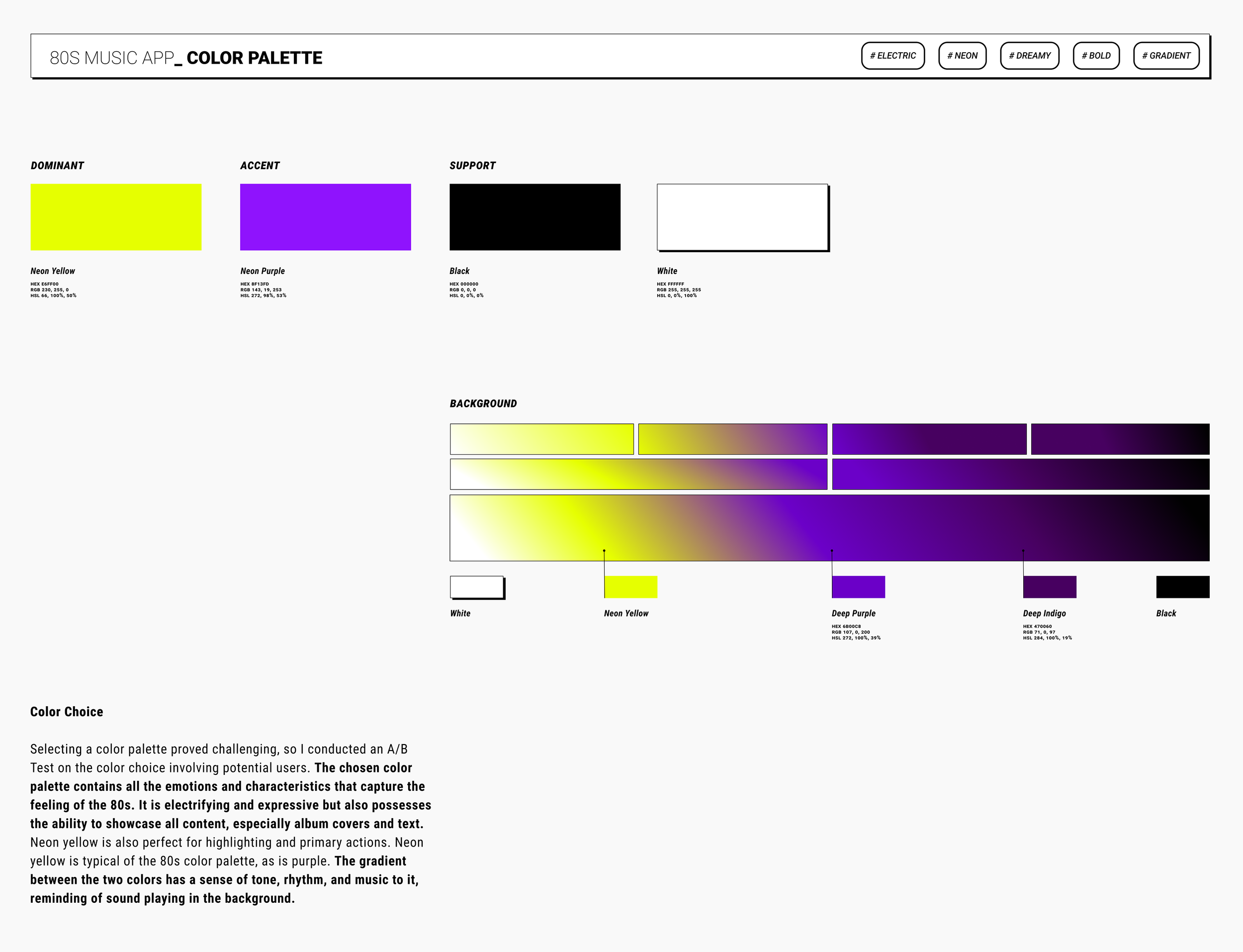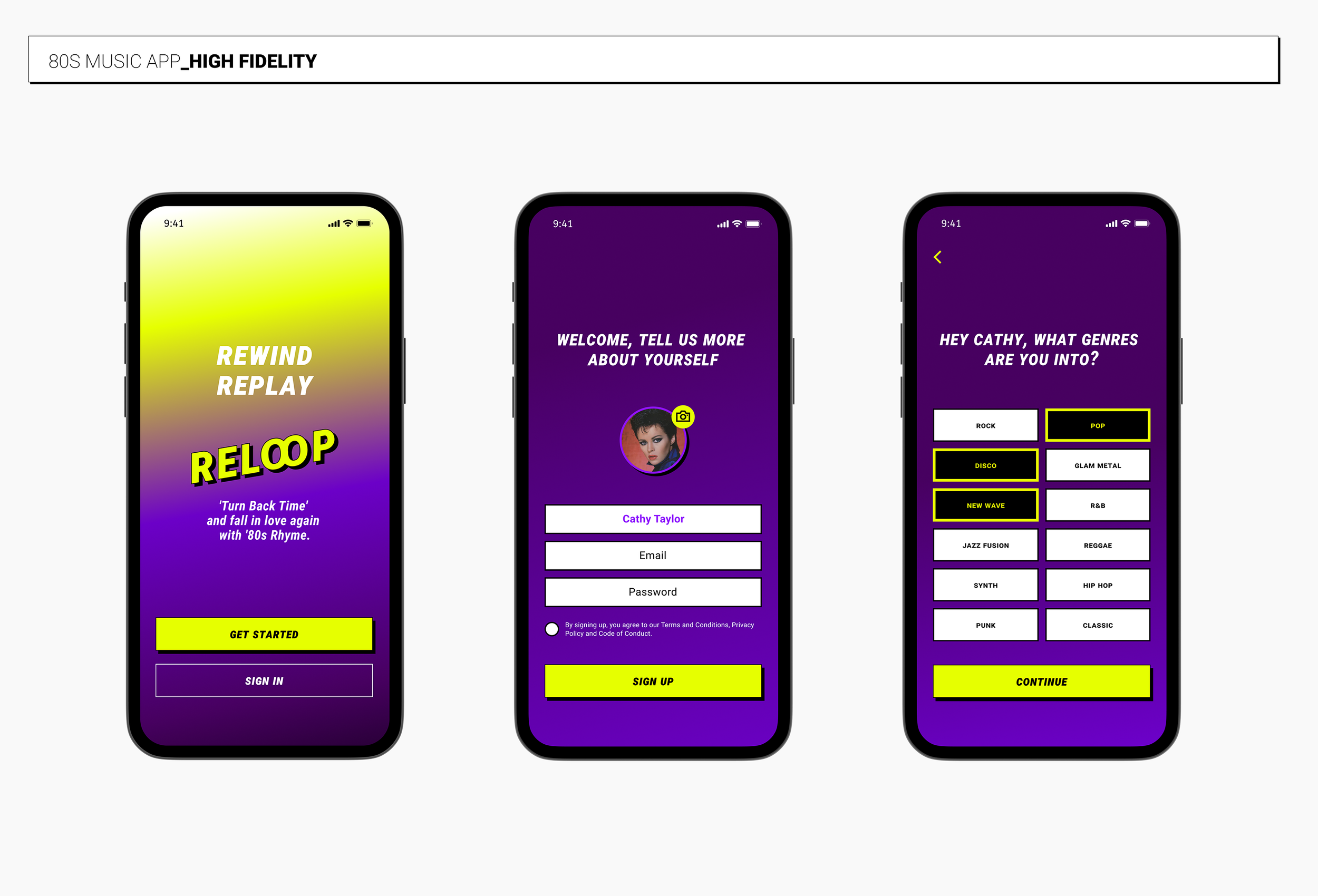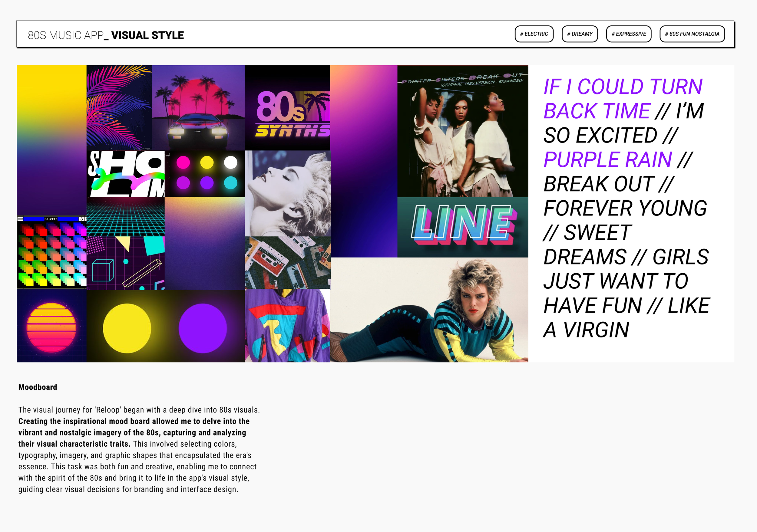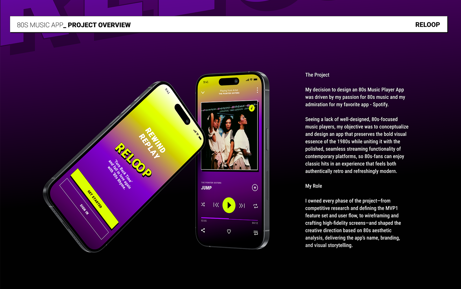 Conceptualized and designed a nostalgic yet modern music streaming app for 80s enthusiasts. Led the full creative direction, including branding, visual identity, and high-fidelity UI design. Applied competitor research, user flow planning, and wireframing to create a personalized and engaging user experience aligned with mobile design best practices.